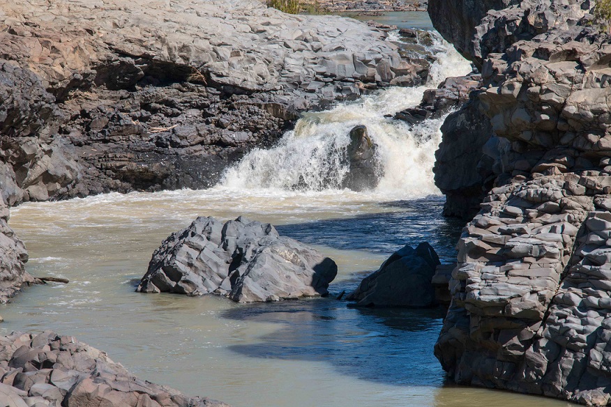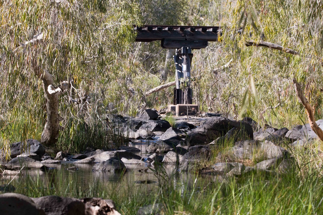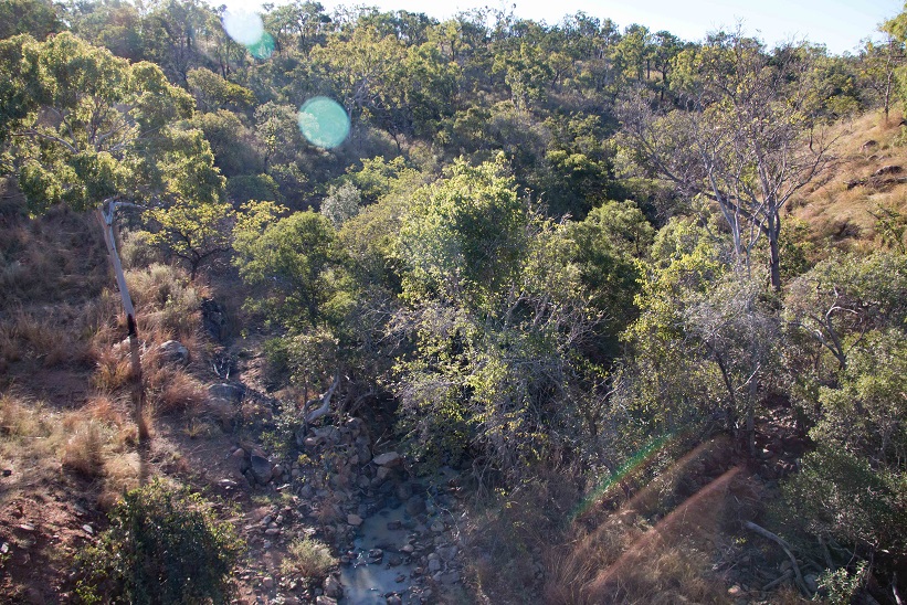 The stream the bullock found was named Elizabeth Creek (after Ezra’s wife, Lizzie). It is why the Savannahlander has a station at Mt Surprise, and it runs 300 metres down from the edge of Joe and Jo’s property. Pete and I went to look, slipping through the fence and down a rudimentary path through the scrub. It’s rugged going, picking your way between the basalt crags sticking out of the ground. Another person from our party walked down this path and fell over. We managed to make it unscathed to a lovely watercourse of crystal clear water flowing between reed beds and paperbarks. It’s one of the few permanent watercourses around here. I had the big lens with me, hoping for wildlife (there wasn’t any). It’s not good for landscape shots, but the picture at the top of the post shows the stream and the railway bridge.